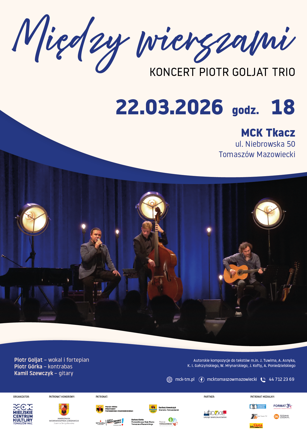 Na scenie wystąpi Piotr Goljat – śpiew, fortepian i prowadzenie koncertu – artysta o niezwykłej wrażliwości i charyzmie. Wokalista, pianista i kompozytor, absolwent PSM w Łodzi oraz Akademii Muzycznej w Katowicach. Laureat wielu prestiżowych festiwali piosenki literackiej. Współpracował m.in. z zespołem Rezerwat, Elżbietą Adamiak, Andrzejem Poniedzielskim i Jerzym Filarem. Autor albumów inspirowanych twórczością Juliana Tuwima oraz płyty Nieobecni?.